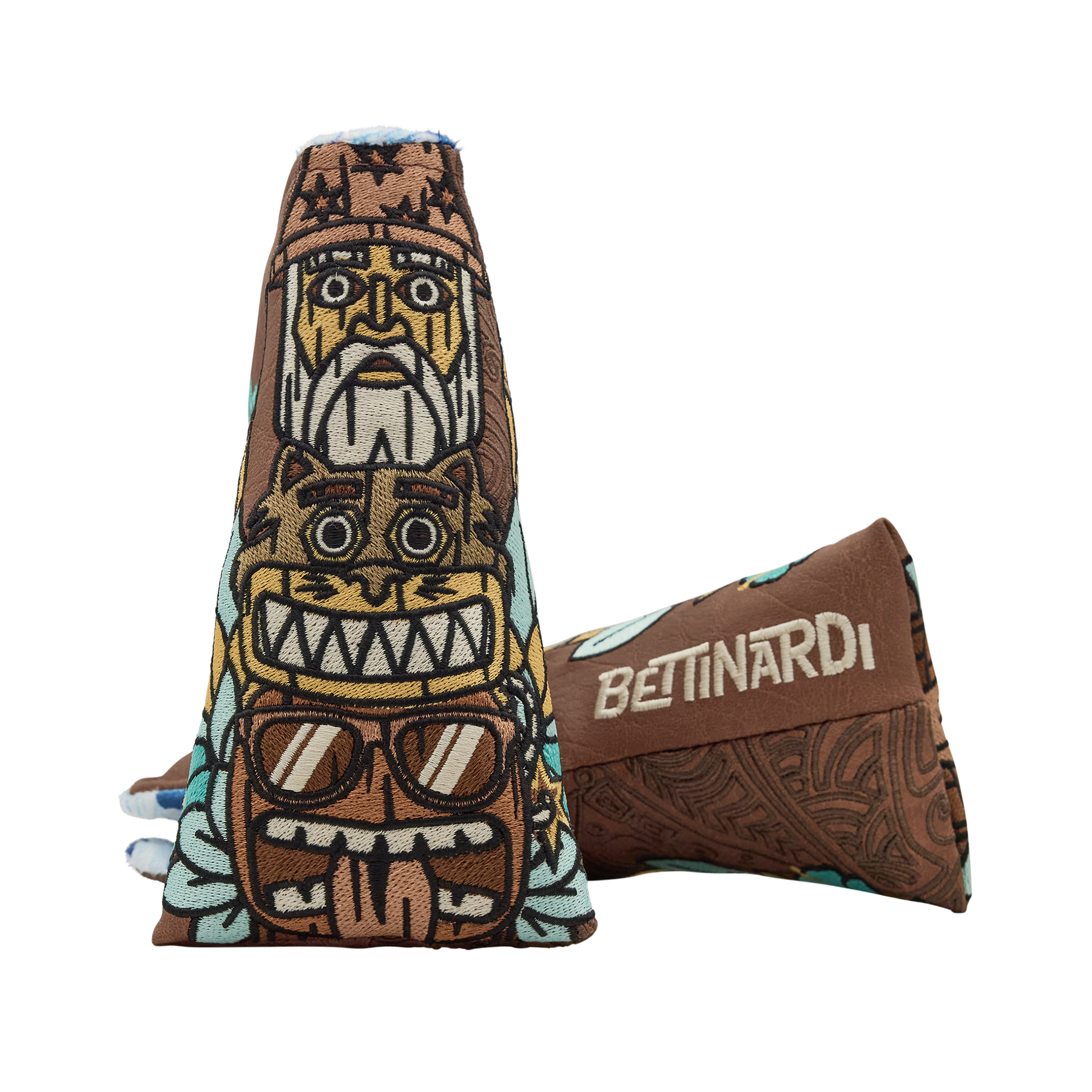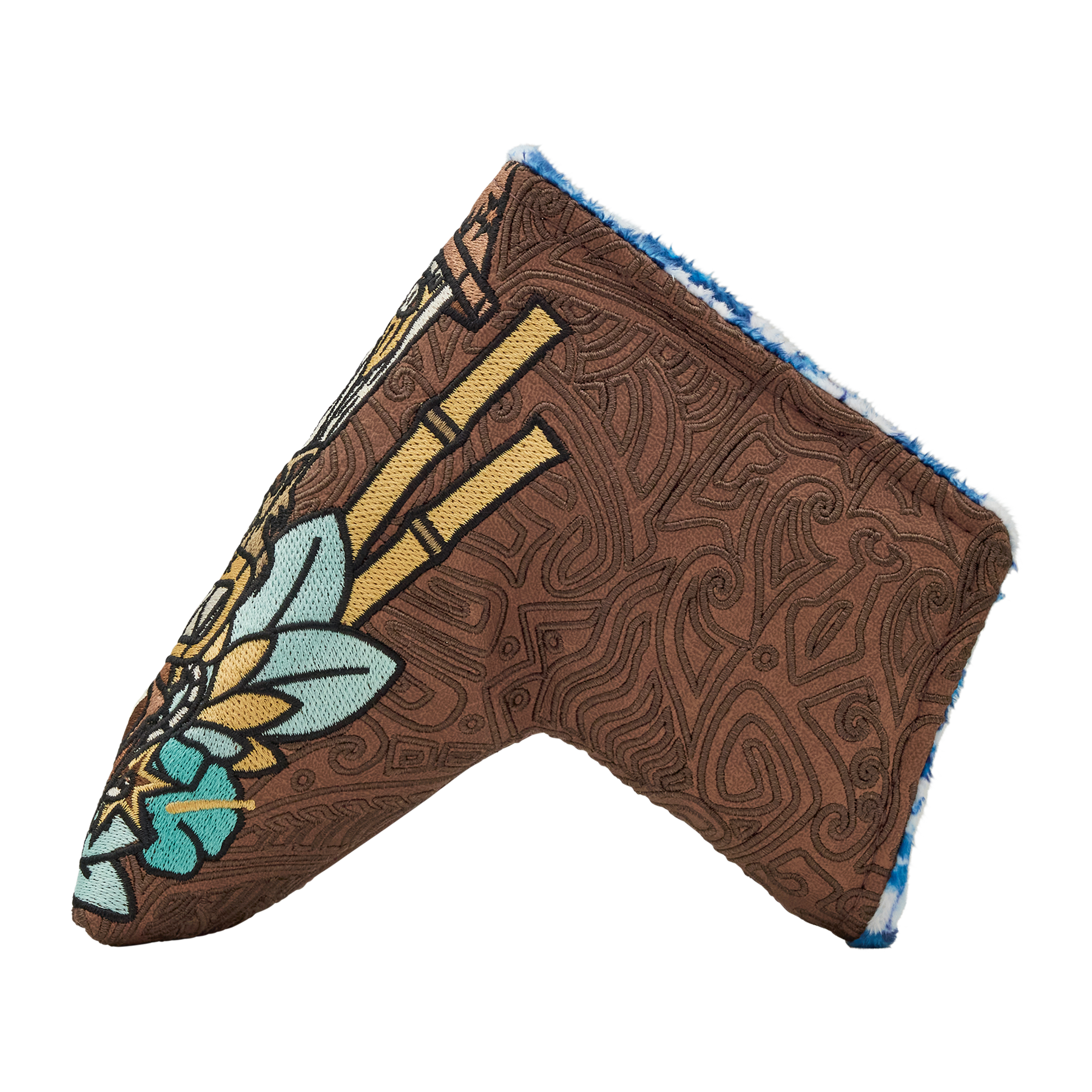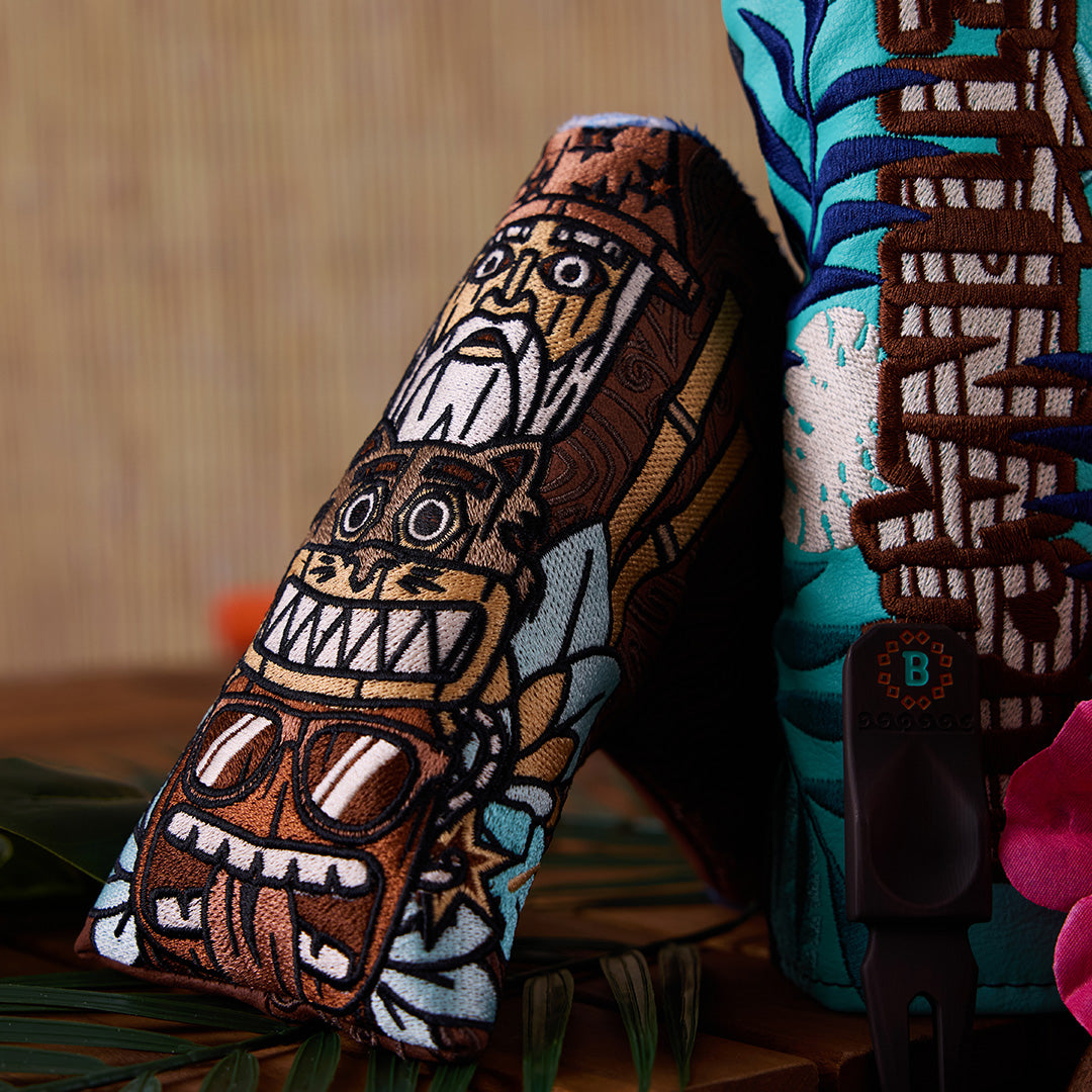 The aloha attitude has taken over THE HIVE™! This blade putter headcover features our Icons carved as Tiki Totems, stacked on a rich textured brown base with tribal print-inspired embroidery. The side of this headcover features a Bettinardi wordmark and tropical Hex B, and the interior is finished with a blue and white hibiscus-pattern plush fabric and magnetic closure. Limited quantities are available. Limit 1 per person, good luck!